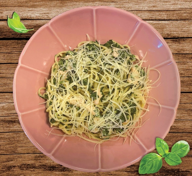 феттучине с лососем и шпинатом, томленные в сливочном соусе и сыром пармезан