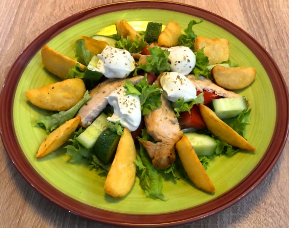 лист салата, картофель по-деревенски, помидоры, огурцы, куриное филе, сметана