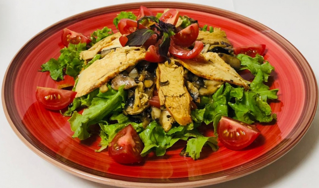 Листья салата, огурцы, помидоры, обжаренные грибы шампиньоны, куриное филе, горчично-цитрусовый соус