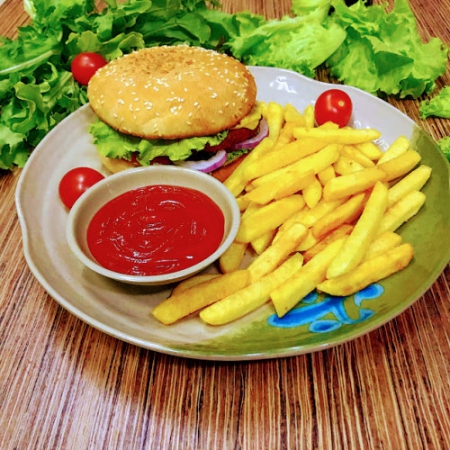Говяжья или куриная котлета, помидор, маринованные огурцы, сыр, лук, лист салата, картофель Фри, кетчуп