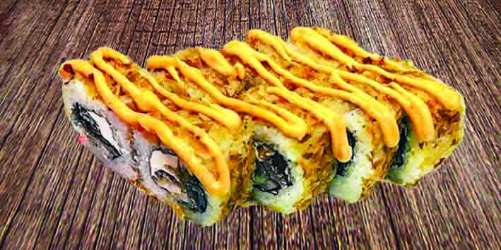 Угорь, стружка тунца, соус спайс, сыр «Филадельфия», рис, нори