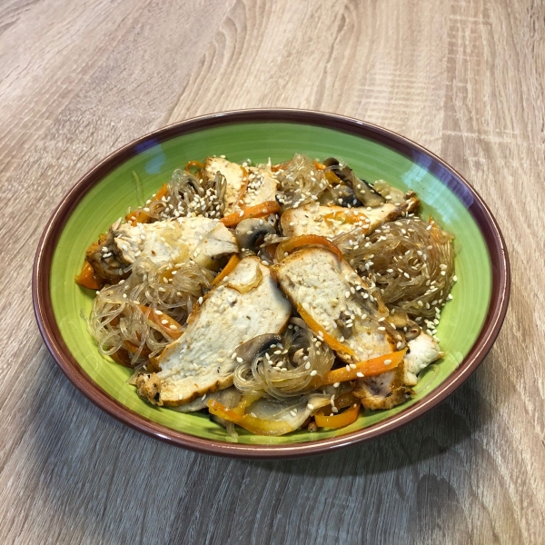 фунчоза, куриное филе, грибы шампиньоны, лук, болгарский перец, морковь, кунжут, соус терияки