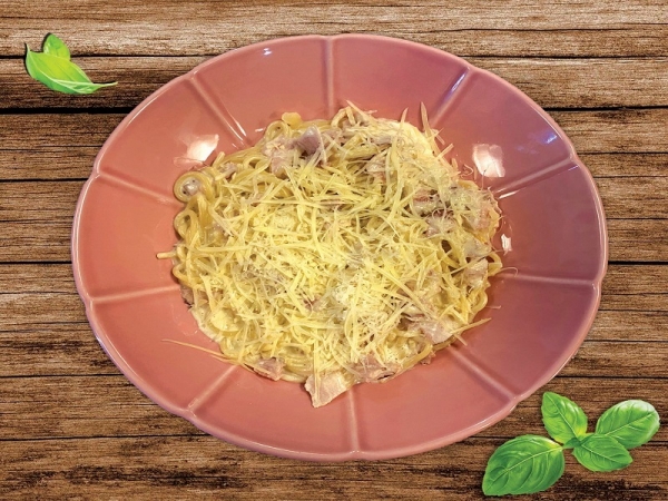 Спагетти с беконом, томленые в сливочном соусе с добавлением яичного желтка и сыра Пармезан