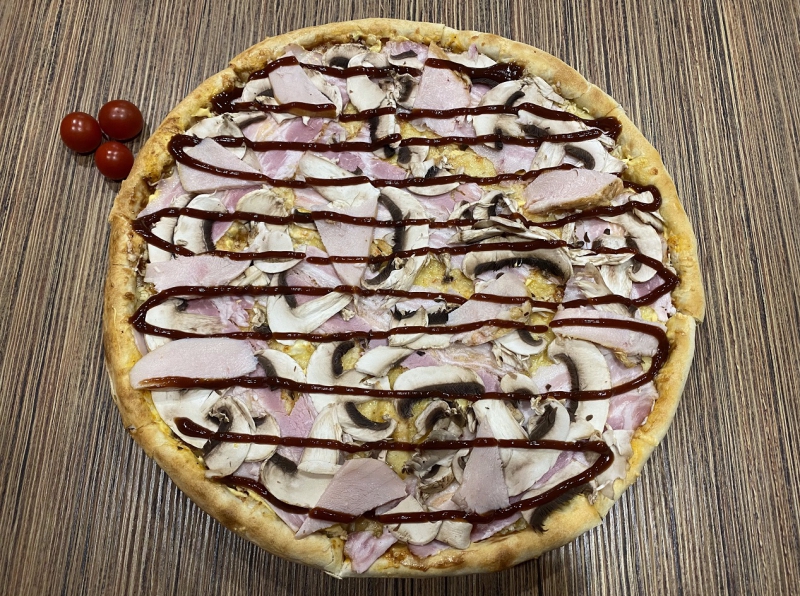 Бекон, курочка копченая, грибы, соус барбекю, неаполитанский соус, сыр гауда