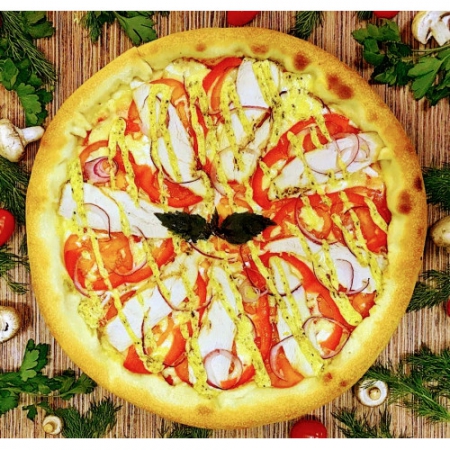 Неаполитанский соус, Гауда, нежное филе курицы, помидоры, болгарский перец, лук, чесночный соус