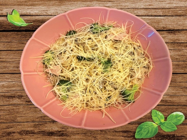 Спагетти с ветчиной, грибами шампиньонами, брокколи, томленные в сливочно-томатном соусе с добавлением ароматного лука и сыра Пармезан