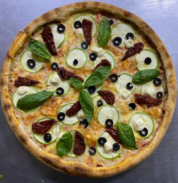 Неаполитанский соус, Гауда, цукини, маслины, сыр Фета, вяленые томаты, свежий базилик.