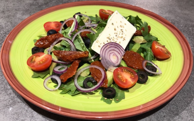 вяленые томаты, киноа, руккола, лист салата, красный лук, фета, маслины, черри, авокадо, масло оливковое