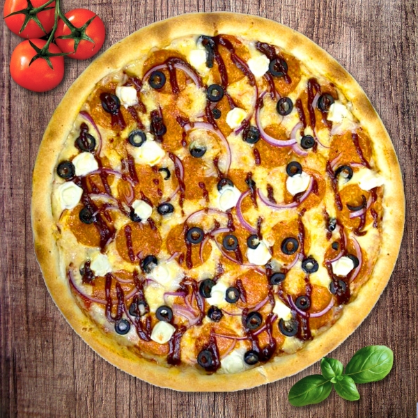 Неаполитанский соус, Гауда, пепперони, маслины, красный лук, сыр Фета, соус барбекю.