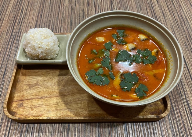 Кисло-острый тайский суп на основе кокосового молока и набором специй том ям : креветки тигровые, лосось, кольца кальмара, грибы, лук, корень имбиря, кинза, рис, кунжут
