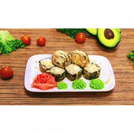 Угорь, креветка тигровая, сыр «Филадельфия», авокадо, кляр, ореховый соус, рис, нори