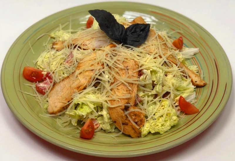 Пекинская капуста, нежное куриное филе, помидоры, сухарики, оригинальный соус "цезарь", сыр пармезан