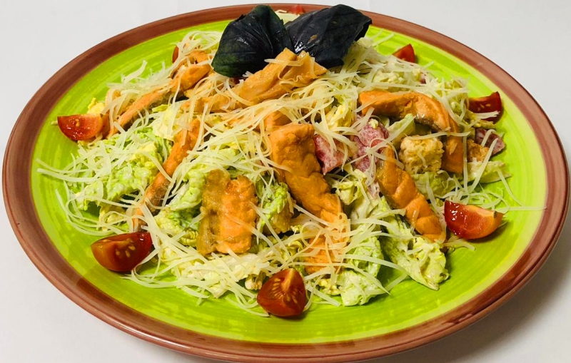 Пекинская капуста, филе семги, помидоры, сухарики, оригинальный соус "Цезарь", сыр пармезан