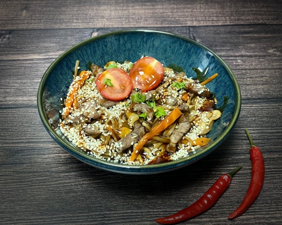 Лапша удон, говядина, грибы шампиньоны, лук, болгарский перец, морковь, кунжут, соус терияки