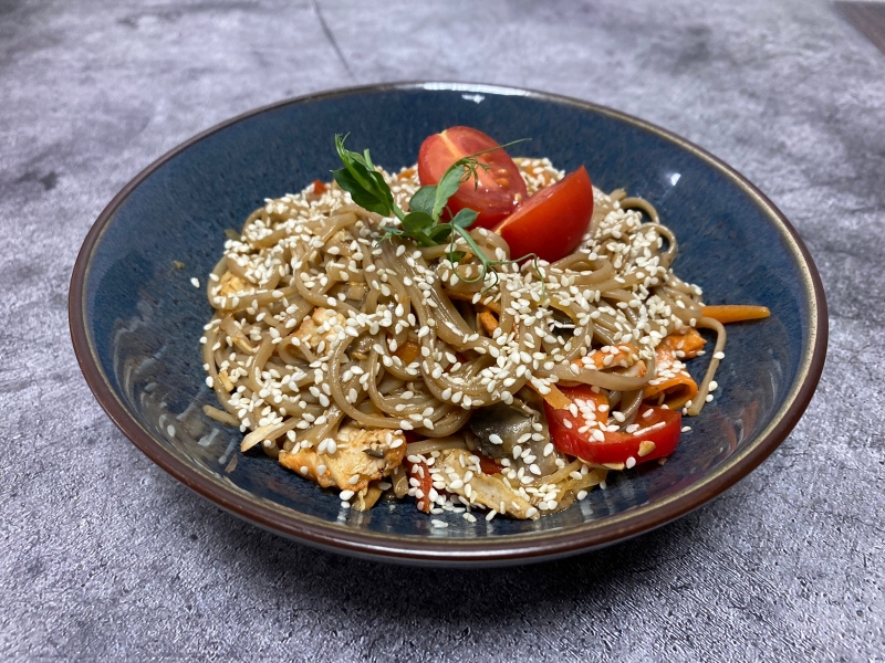 Удон, куриное филе, грибы шампиньоны, лук, болгарский перец, морковь, кунжут, соус терияки