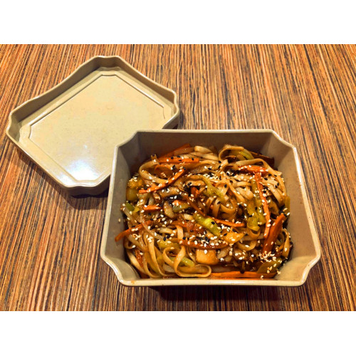 Лапша удон, грибы шампиньоны, лук, болгарский перец, морковь, кунжут, соус терияки