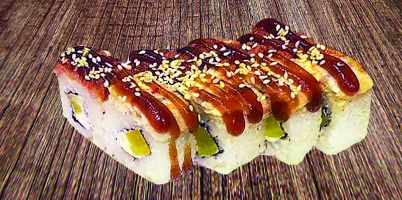 Угорь, сыр «Филадельфия», такуан, соус «Унаги», кунжут, рис, нори
