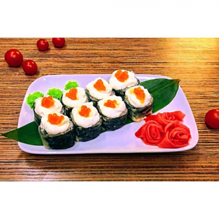 Угорь, сыр «Филадельфия», икра лососевая, кляр, рис, нори